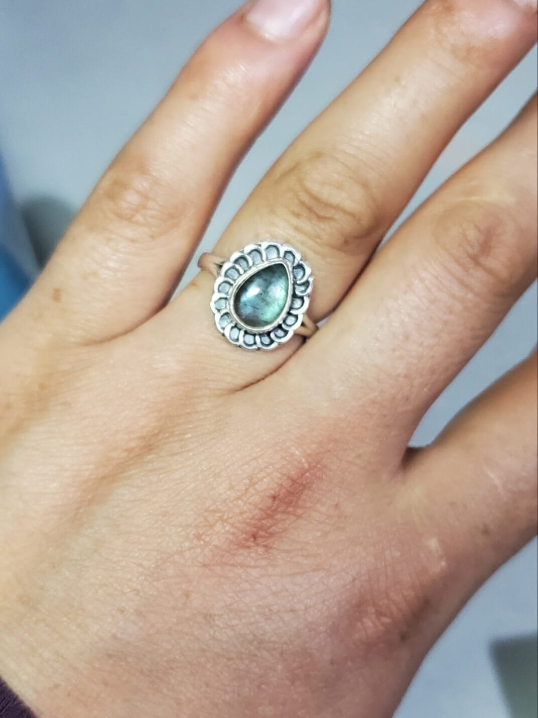 Anillo de labradorita en corte gota con detalles de plata al rededor, elaborada en plata 925 una joya única que perdura en el tiempo. Un anillo con alma propia, creado para quienes buscan belleza, poder interior y conexión espiritual en una sola joya.