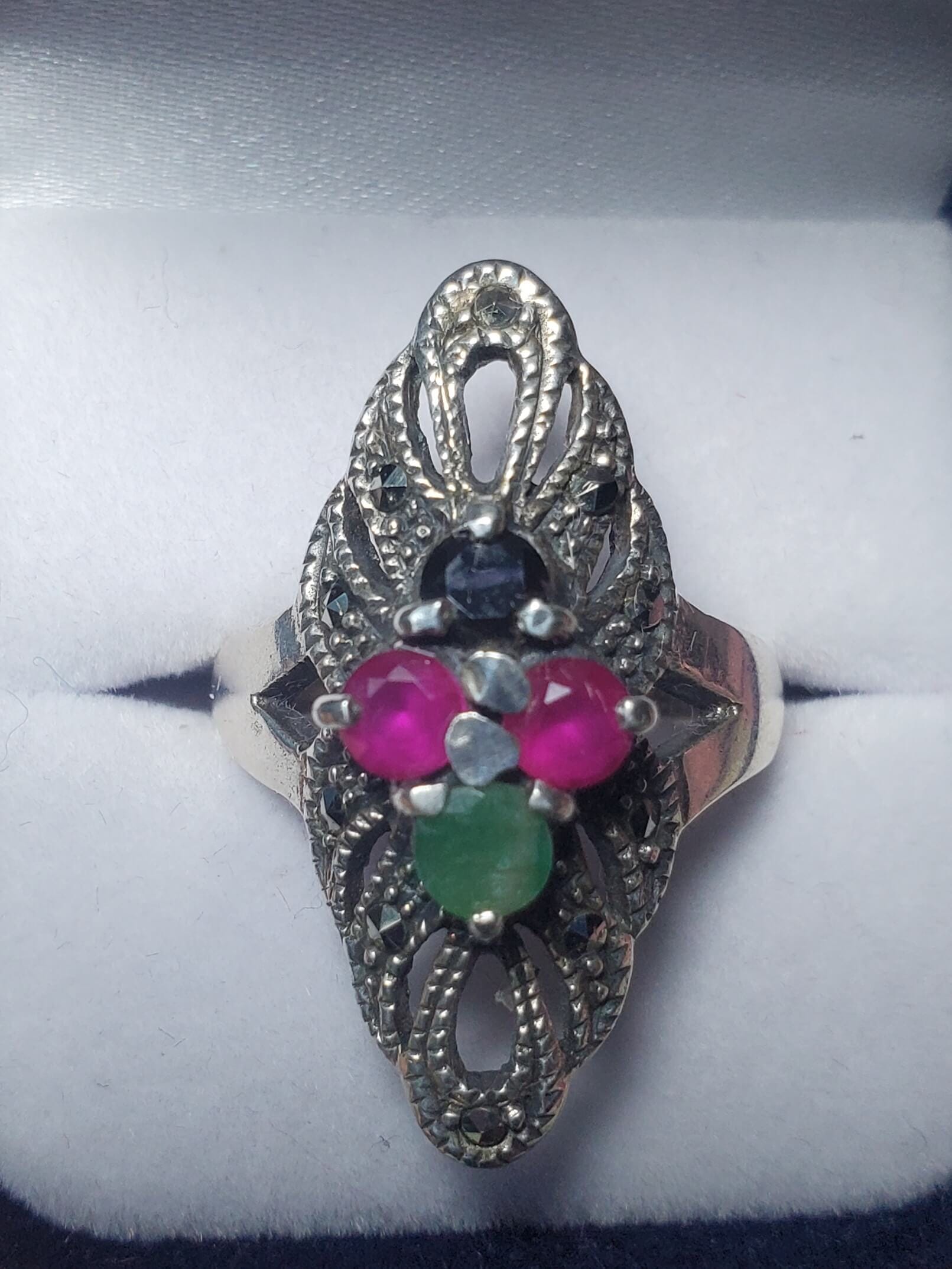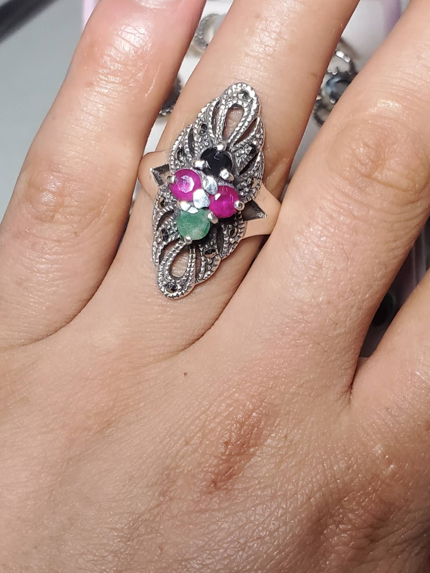Anillo de marquesitas con piedras naturales rubí, esmeralda y ónix negro elaborado en plata 925. Una joya poderosa para quienes buscan belleza con intención: protección, amor y poder en una sola pieza. 💫💎