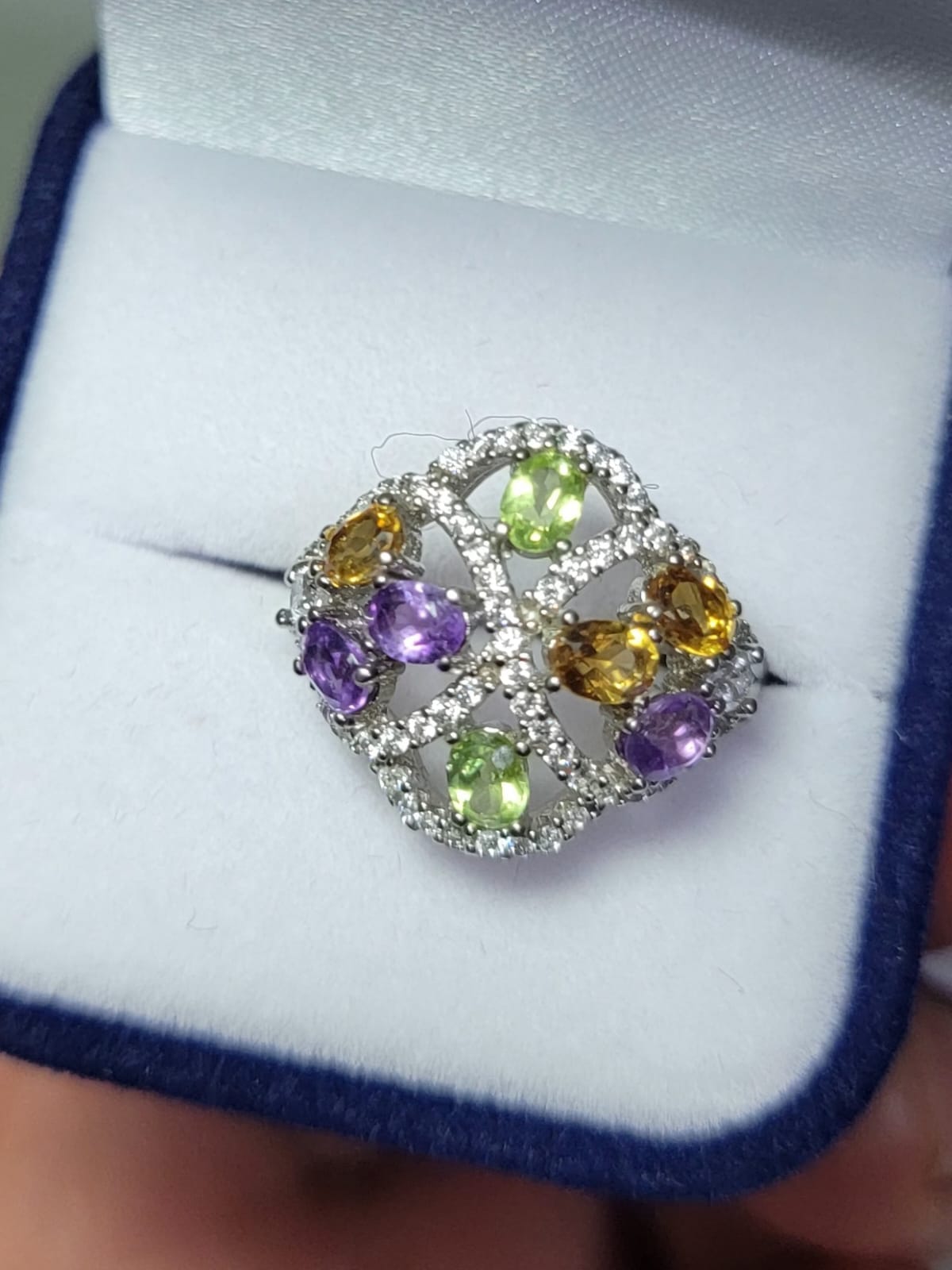 Una obra maestra hecho a mano en Plata Fina 925 con baño en rodio para mayor brillo y durabilidad, con un diseño exclusivo. No es solo una joya, es un amuleto de lujo y bienestar. Sus gemas naturales (Amatista, Citrino y Peridoto) están rodeadas de brillantes circonios, ofreciendo una calidad insuperable y un brillo que atrae miradas.