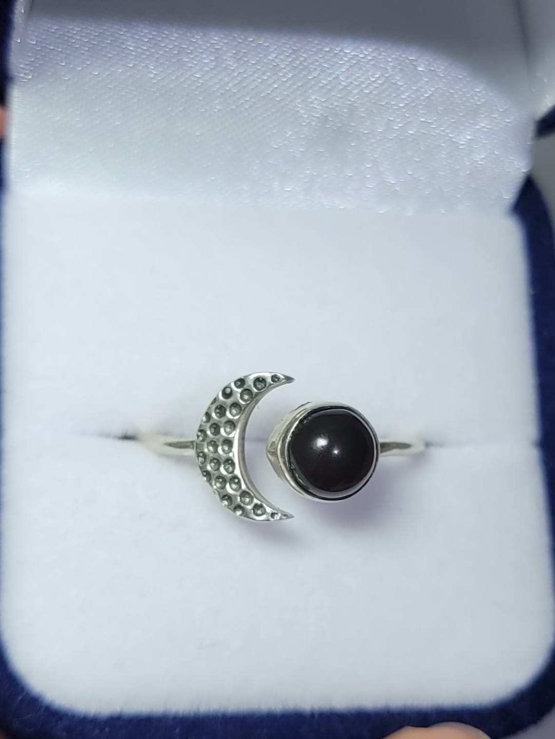 Este anillo presenta una imponente piedra de ónix negro pulido, símbolo de protección y fortaleza, actuando como un lienzo oscuro para el protagonista: un delicado motivo de media luna. Meticulosamente elaborado en plata de ley .925, cada detalle refleja una artesanía de calidad premium.