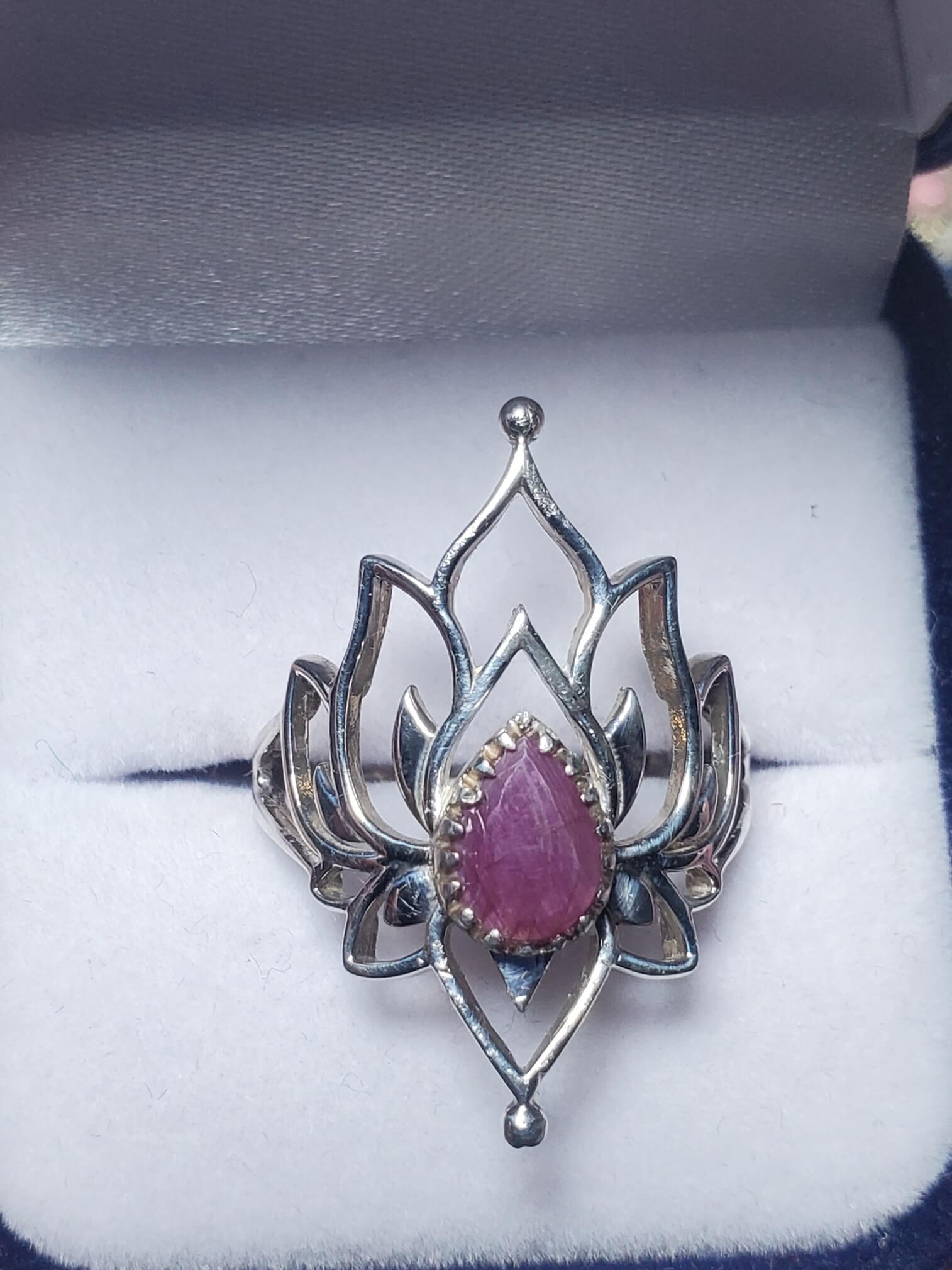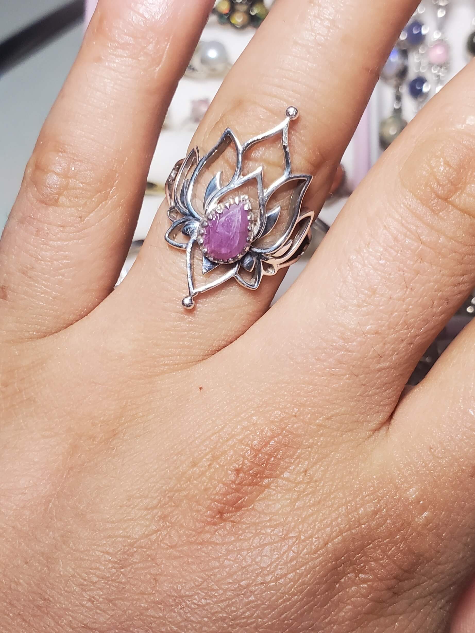 Transforma tu energía con esta joya única. anillo de Rubí natural (la piedra del amor y la vitalidad) elaborado a mano en una delicada Flor de Loto de Plata 925. Pieza única que atrae la pasión, la abundancia y te infunde una energía poderosa y protectora. Diseño Exclusivo: Una pieza artesanal que fusiona la belleza natural con la maestría de la plata.