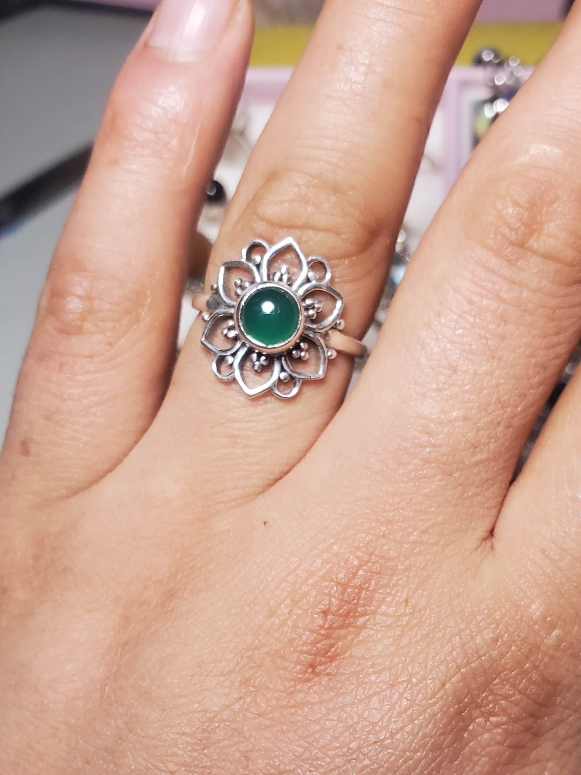 Anillo de flor de loto con piedra natural ónix verde elaborado a mano en plata 925, una joya duradera que protege, equilibra y potencia la fuerza interior. Pieza exclusiva para quienes buscan poder, armonía y estilo único en cada gesto.