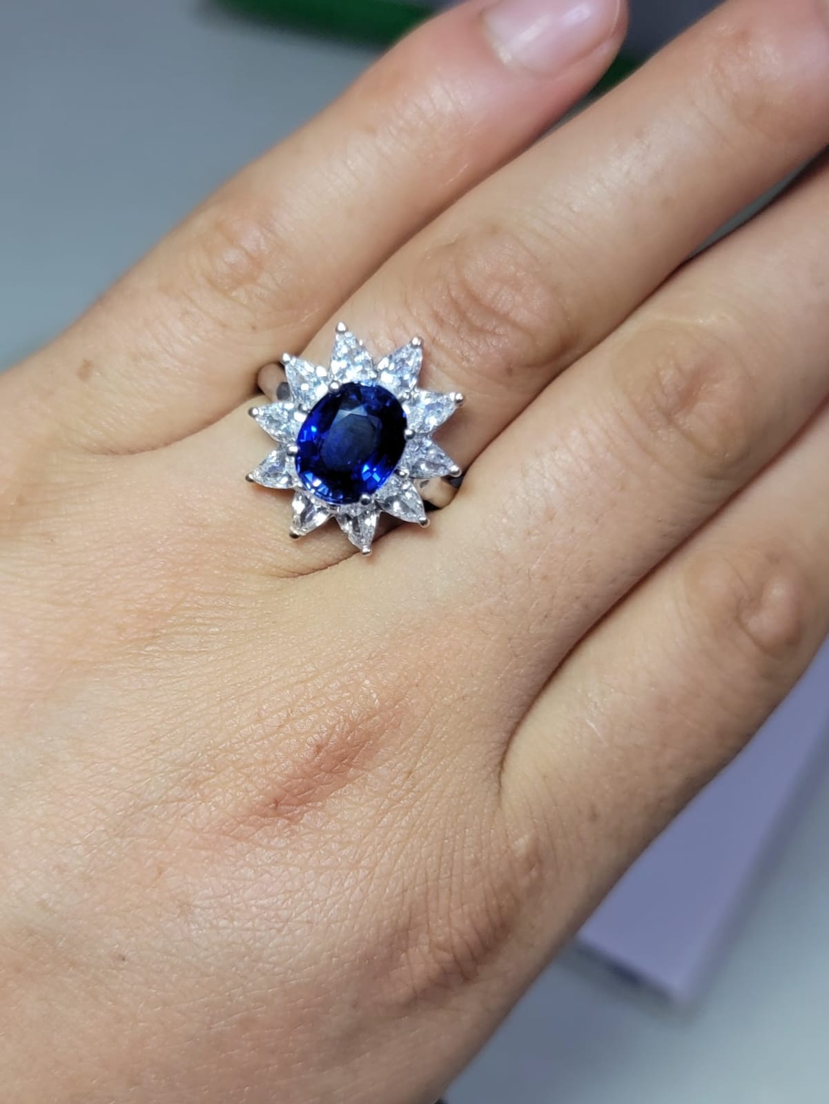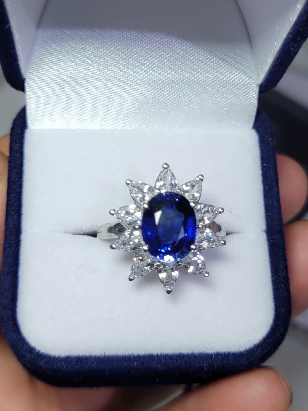 Un zafiro azul de laboratorio de claridad impecable, rodeado por un halo de circones blancos de alta calidad que capturan cada rayo de luz. elaborado en plata fina ley 925, es la pieza perfecta para quien busca lujo, ética y un brillo inolvidable.