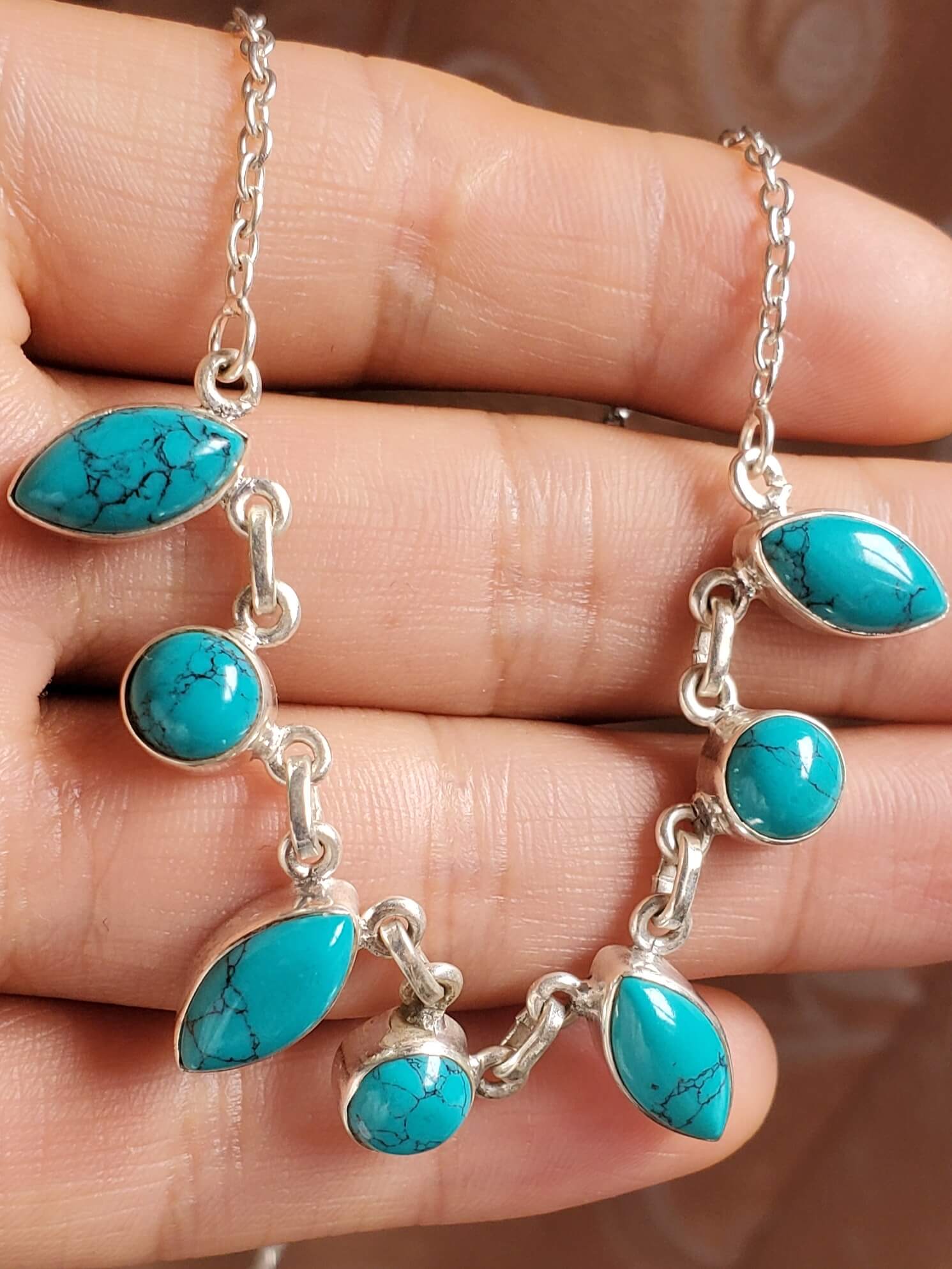 Descubre la sofisticación en su forma más auténtica con nuestro collar de turquesa natural en corte marquesa, delicadamente elaborado en plata ley 925.